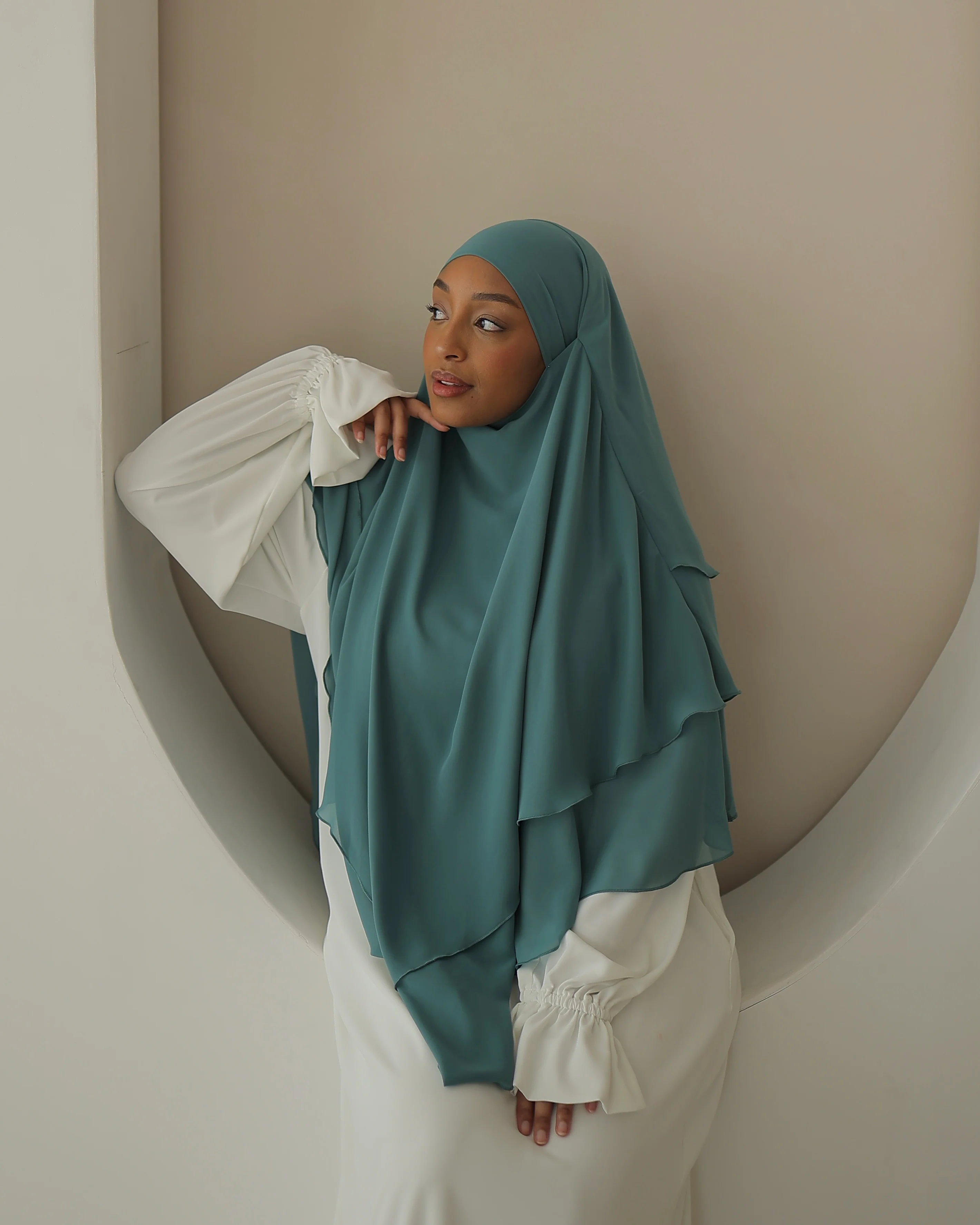 Unser dreilagiger Chiffon Khimar verkörpert schlichte Eleganz. Hergestellt aus hochwertigem Chiffon und vernäht mit größter Präzision, bietet er eine luxuriöse Fülle und einen schönen Fall. Die großzügige Länge und der weiche Griff sorgen für maximalen Tragekomfort bei optimaler Bedeckung. Mit seinem romantischen Design ist dieser Khimar perfekt für jeden Anlass und verleiht deinem Gesicht die schönste Umrandung! Probier‘s unbedingt aus - wir LIEBEN es!